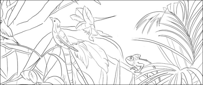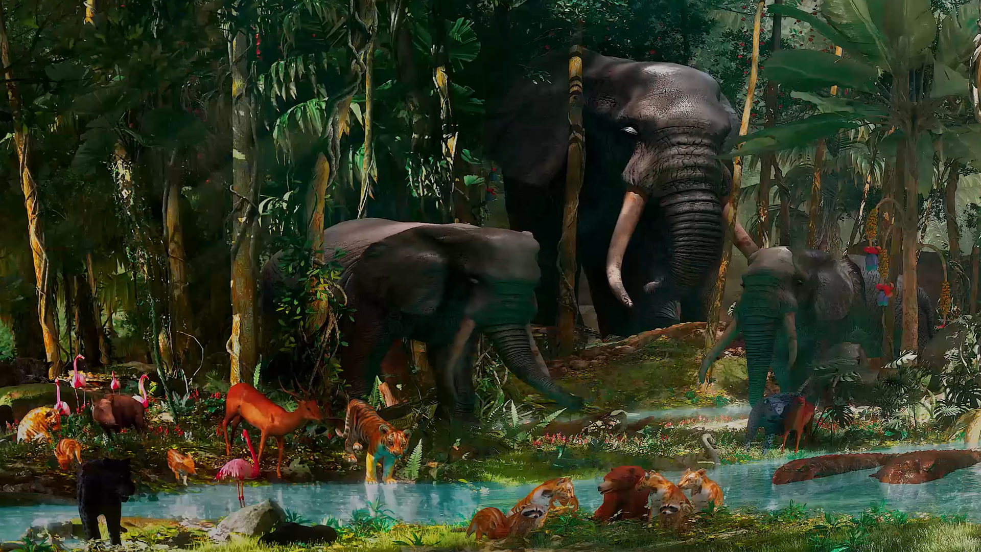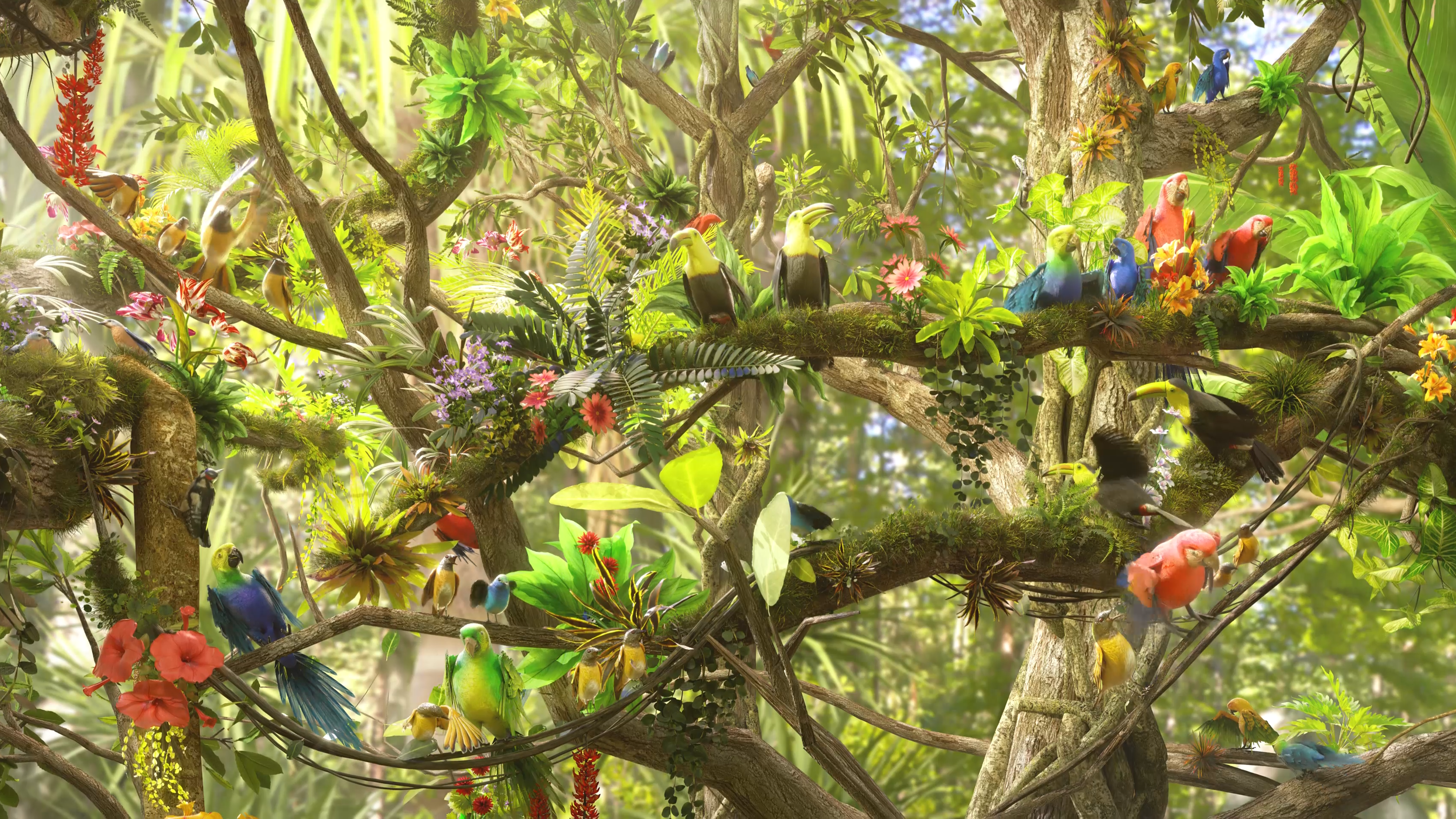 나무 사이로 뻐꾸기, 큰부리새, 금붉은앵무, 카멜레온 등이 등장하며 열대우림의 생태계를 보여줍니다.