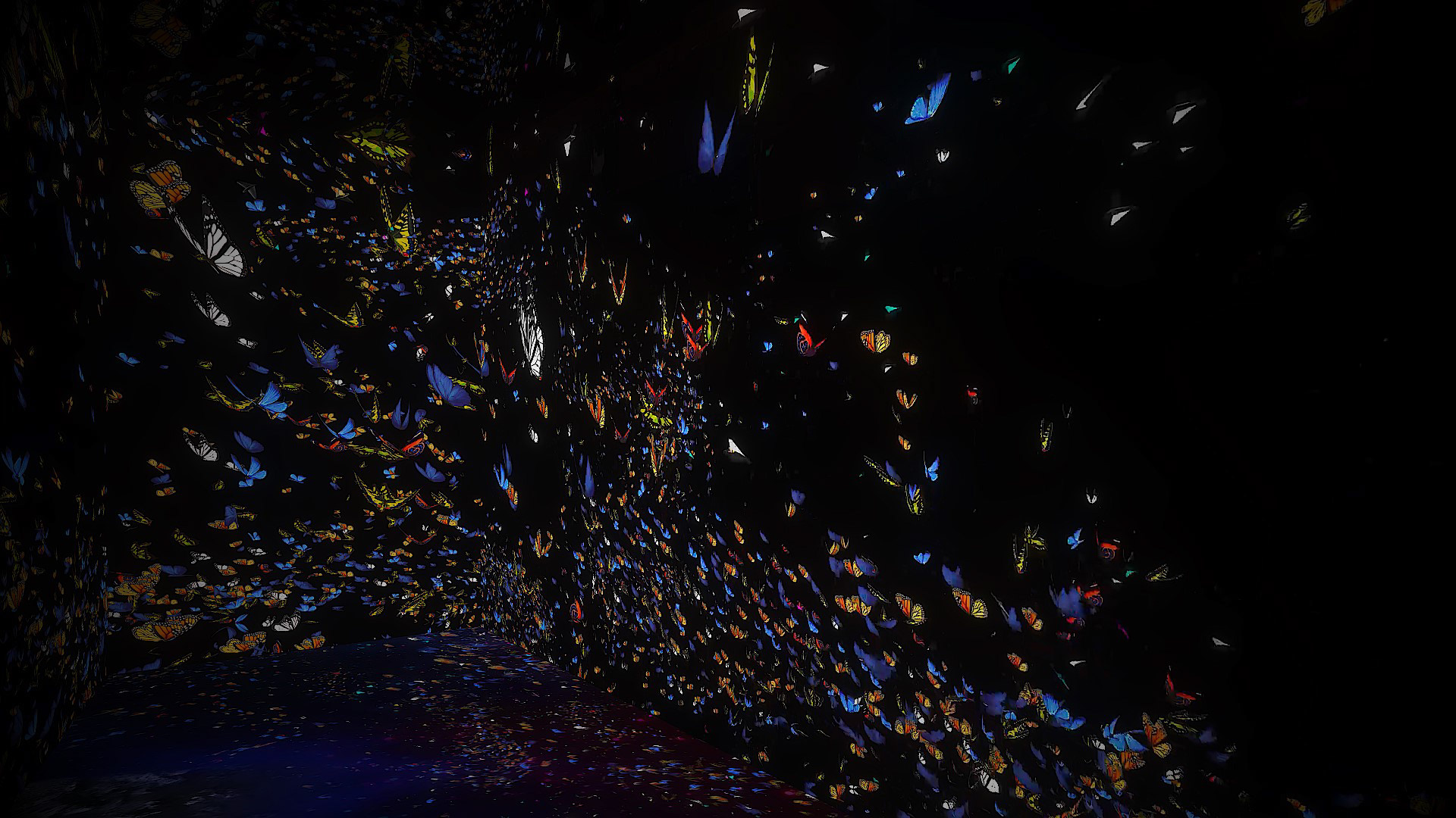 빛과 색채에 반응하며 부드럽게 흐르는 나비들의 궤적은, 홀 안을 감싸는 거대한 파도처럼 퍼져나갑니다.