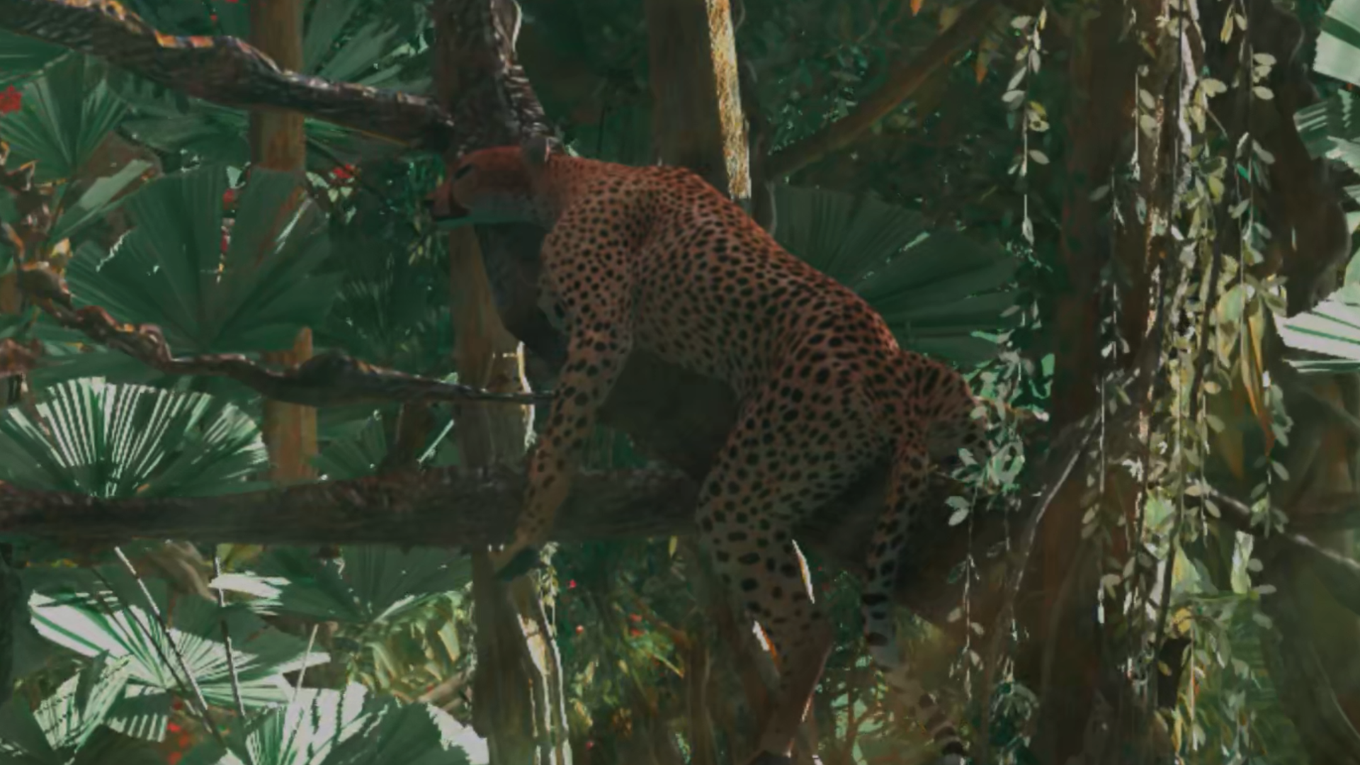 울창한 밀림 속, 표범·보아뱀·원숭이·클루브시새 등이 모습을 드러내며 정글의 생태계가 펼쳐집니다.