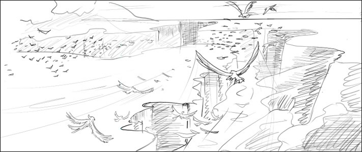 화면 전환은 새들의 비행 궤적과 흩날리는 깃털이 장면을 가리며, 자연스럽게 다음 장면으로 이어집니다.